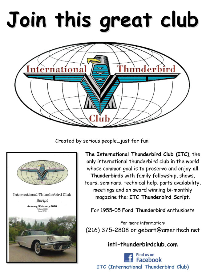 The International Thunderbird Club, the ONLY International Thunderbird Club in the world whose common goal is the preserve and enjoy all Thunderbirds with family fellowship, shows, tours, seminars, technical help, parts availability, meetings and a great bi-monthly magazine the “ITC Thunderbird Script”.